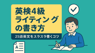 英検対策 英検4級ライティングの書き方:25語英文をスラスラ書くコツ 〜「書けない」を「書ける!」に変えるシンプル思考法〜「英検4級のライティングって何を書けばいいの?」「25語って意外と難しい…」そんな声をよく聞きます。実は、英検4級のライティングは「文法+意見+理由」が書ければOK。難しい表現よりも、“自分の考えをシンプルな英文で伝える力”が問われます。この記事では、英検4級のライティングで確実に点を取るコツと練習法を紹介します。 2025.10.14 英検対策