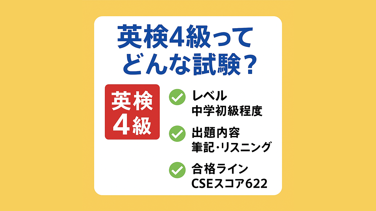 英検4級は、5級の次に目指す入門〜基礎レベルで、中学英語の初中級(CEFR A1相当)が目安。身近な話題について、簡単な語句・短文を理解してやりとりできる力が求められます。