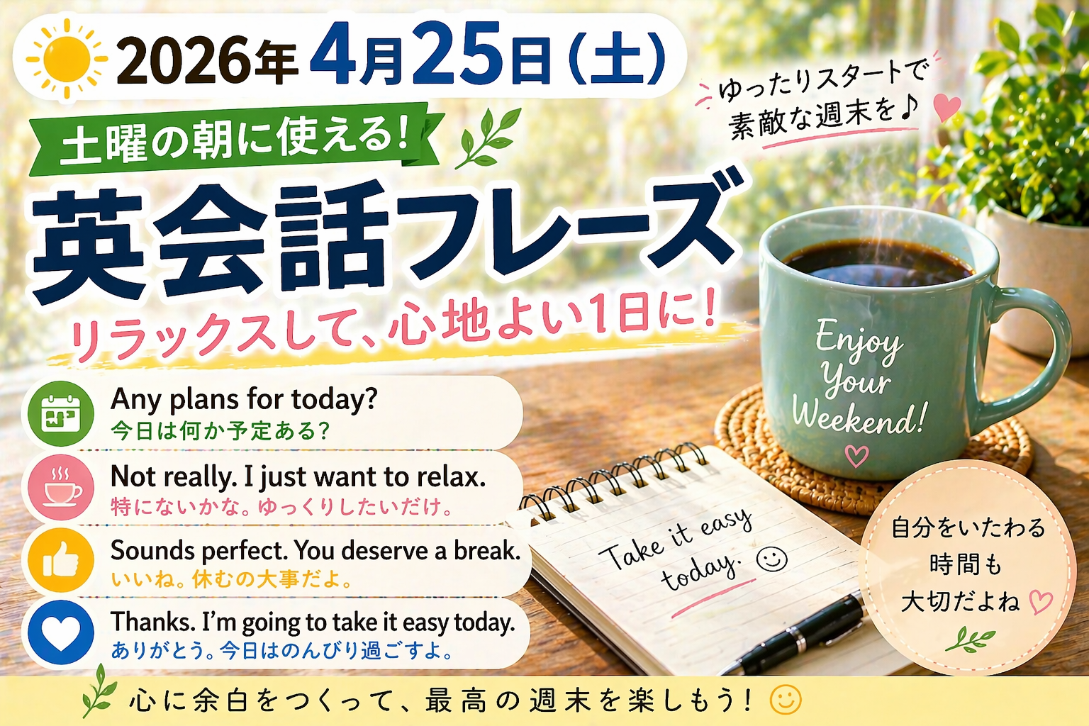 今日はそんなリラックスした土曜の朝にぴったりな英会話フレーズをご紹介します。